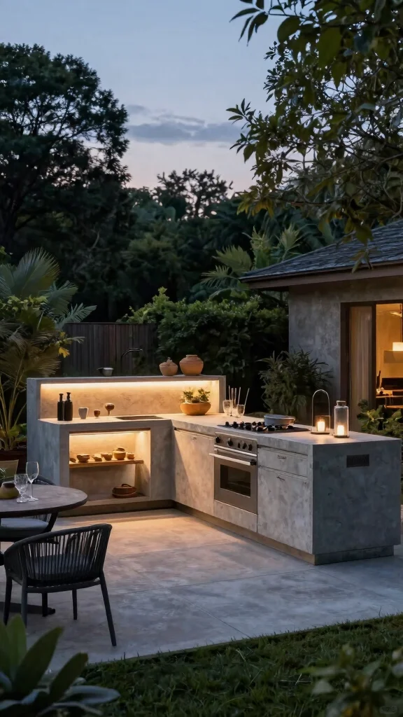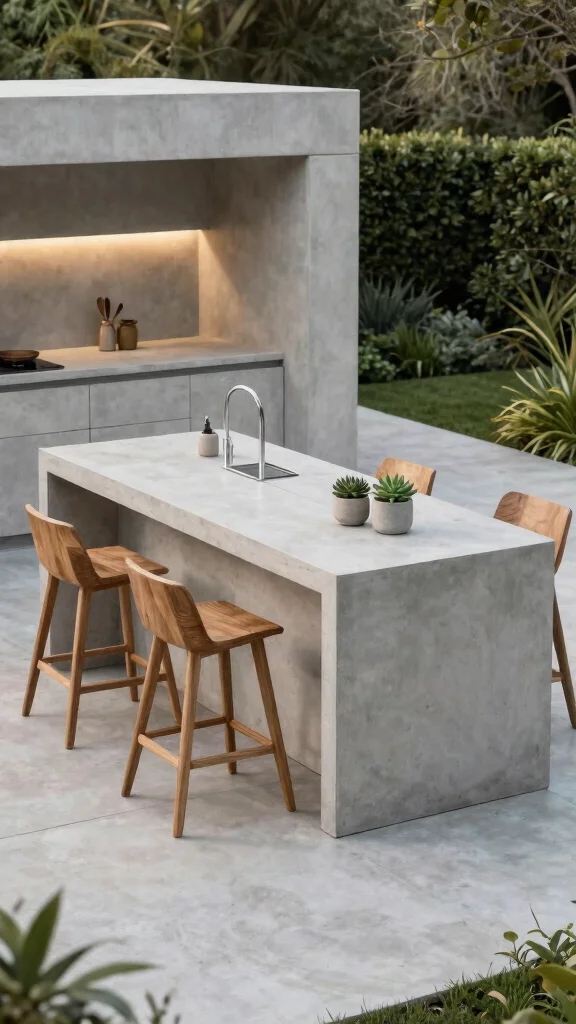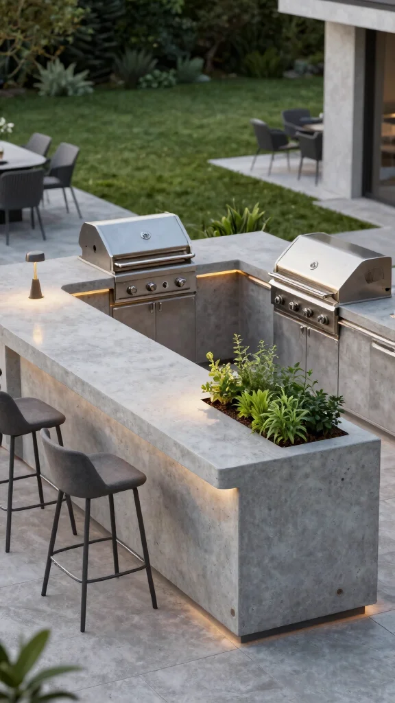 For city dwellers, an urban concrete oasis provides a delightful way to enjoy outdoor cooking in smaller spaces. These designs leverage concrete’s durability to create compact yet stylish kitchens that feel inviting. Picture vertical shelves and planters maximizing every inch of your outdoor area, enhancing functionality without sacrificing style.