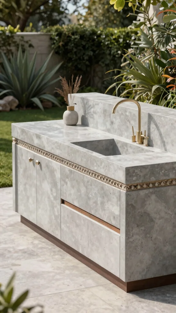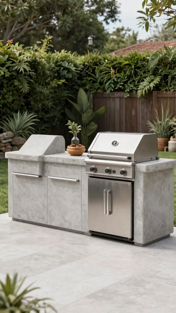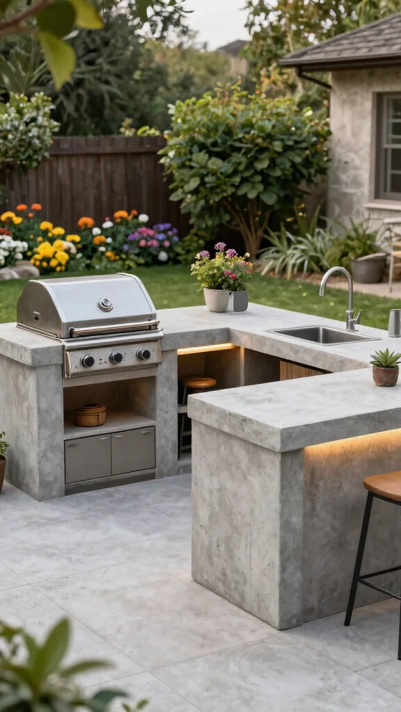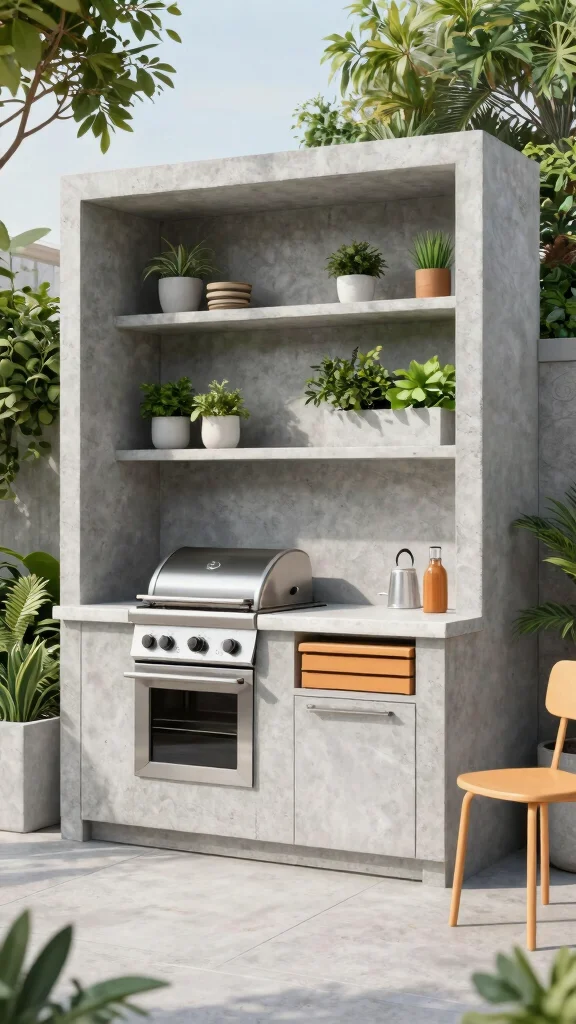 Urban living proves you don’t need a big yard to love your outdoor kitchen concrete. Build vertical shelves and planters to maximize every inch, then add a compact grill and sink for a chic, functional setup you’ll actually use.