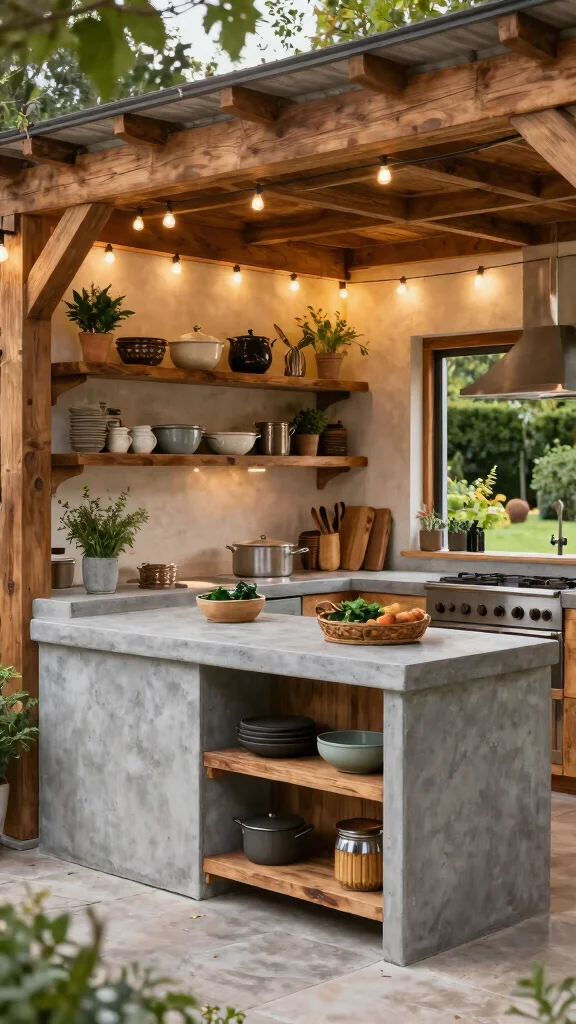 Combining concrete with natural wood creates a warm, inviting atmosphere for your outdoor kitchen. This rustic aesthetic merges the durability of concrete with the organic charm of wood, making it perfect for those who appreciate a cozy, earthy vibe. Picture reclaimed wood beams above a sturdy concrete countertop, offering both beauty and functionality in your cooking space.
