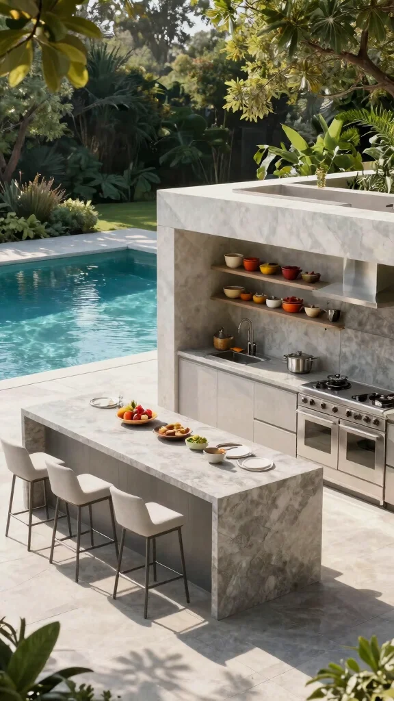 Transform your outdoor kitchen into an integrated poolside bar that serves refreshing cocktails and snacks. This design allows easy access to beverages from the kitchen and poolside, perfect for sunny days spent outdoors. Picture bar stools lining up at the counter, inviting guests to socialize while enjoying the poolside fun.