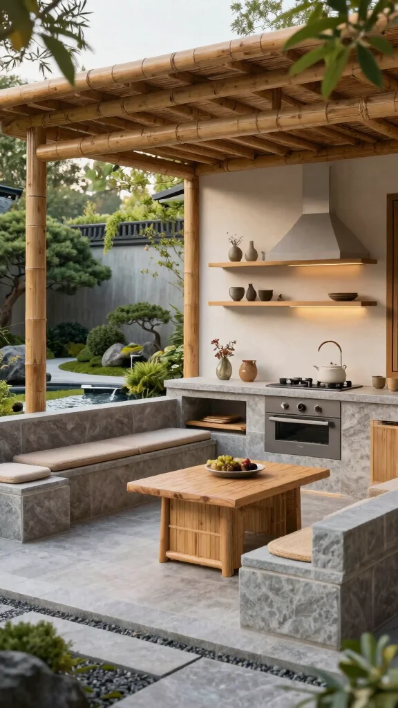 Incorporate elements of tranquility with an Asian-inspired outdoor kitchen that emphasizes harmony and balance. Use natural materials like bamboo and stone, along with soft lighting to create a serene cooking environment. Picture a nearby Zen garden that enhances the calming atmosphere, making it a perfect retreat after a busy day.
