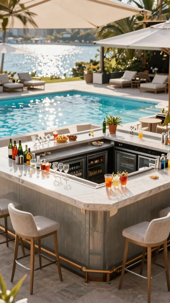 To achieve this setup, consider built-in refrigerators to keep drinks chilled and a variety of glassware for cocktail preparation. Shade features will ensure guests stay cool while sipping their favorite drinks. This bar not only elevates your outdoor cooking space but also enhances the overall poolside experience.