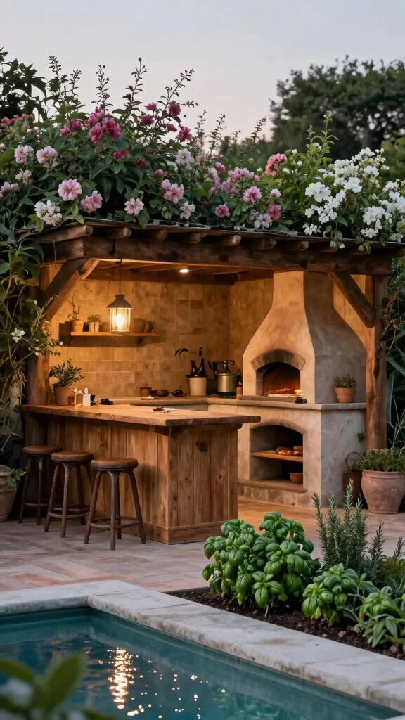 Even in a compact yard, you can achieve a outdoor kitchen pool area that feels like a private resort. Start by defining a dedicated zone near the pool and choosing cohesive materials and colors for outdoor kitchen design and poolside landscaping. Use a built-in grill, a small fridge, and a hidden trash/cleaning station to keep the space tidy. Add a shade solution such as a pergola or retractable canopy and choose planters or screens to create privacy without blocking views. Finish with comfortable backyard entertaining seating and a continuous flooring material that ties the kitchen to the resort-style patios.