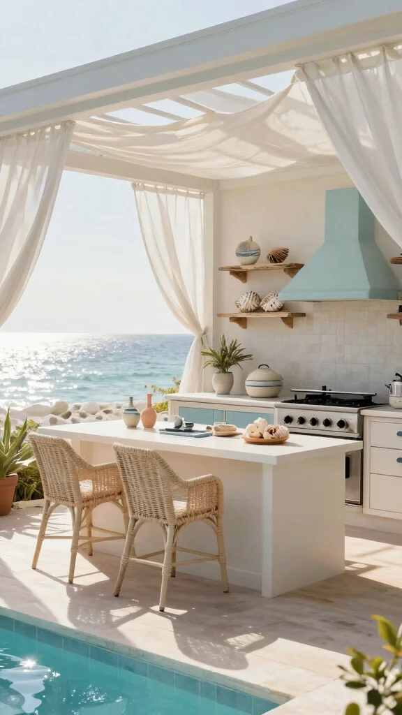 This delightful kitchen design fosters a relaxing atmosphere where friends can enjoy outdoor cooking while embracing the charm of coastal living.