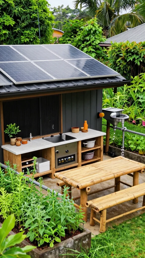 To implement this eco-friendly design, consider solar panels to power your outdoor appliances and rainwater collection systems for watering plants. Recycled materials for countertops and seating areas can also be stylish while minimizing waste. This kitchen setup encourages guilt-free entertaining, allowing you to enjoy every meal with a clear conscience.