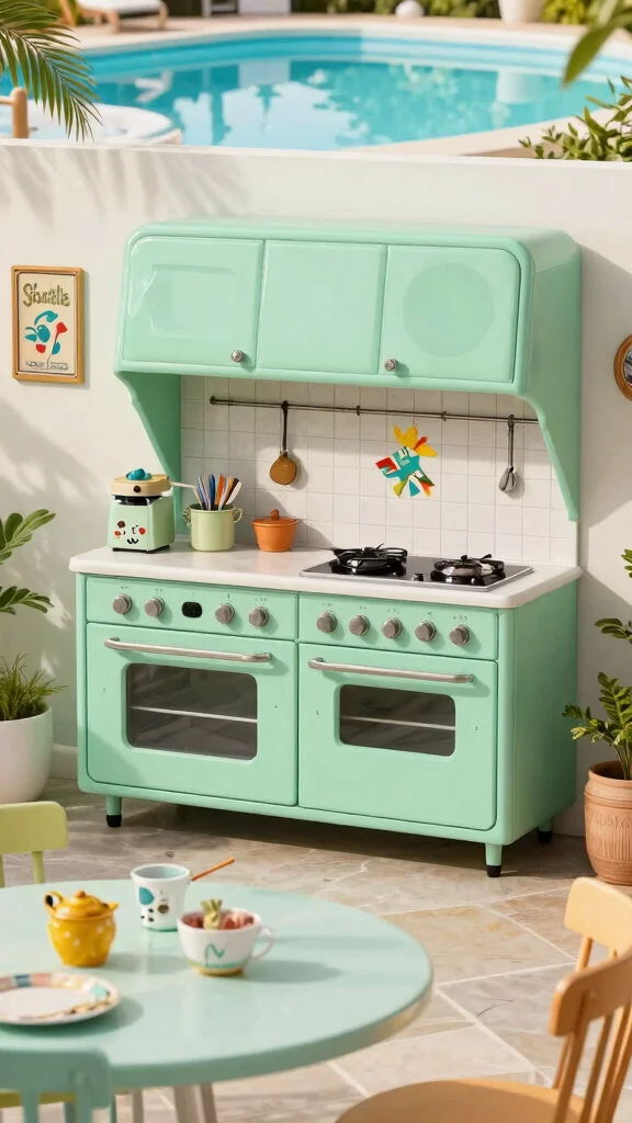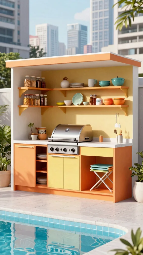 Maximize your small poolside space with a stylish urban outdoor kitchen that blends functionality with flair. This compact design uses vertical space efficiently, incorporating cabinets and shelving to keep essentials organized while showcasing bold colors and patterns. Think vibrant accents that reflect the lively city vibe.