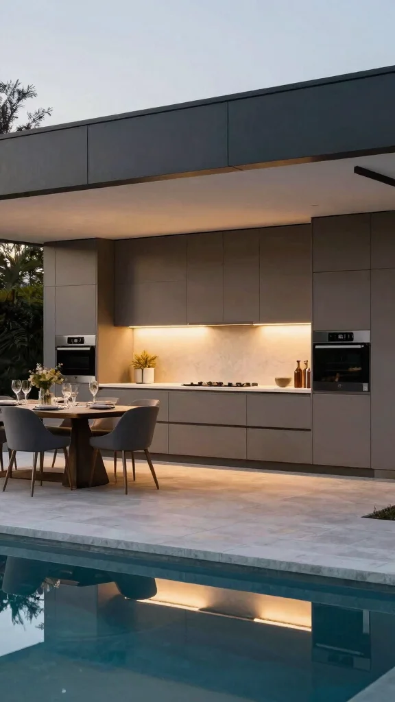 The beauty of a modern minimalist outdoor kitchen lies in its ability to combine functionality with elegance. This design embraces clean lines and a neutral color palette, fostering a sense of calm and visual harmony. Imagine stainless steel appliances shining against a backdrop of sleek cabinetry, while a spacious island serves as both a cooking station and a gathering spot for family and friends. Adding elements like natural stone countertops enhances the organic feel, blending seamlessly with the outdoor environment.