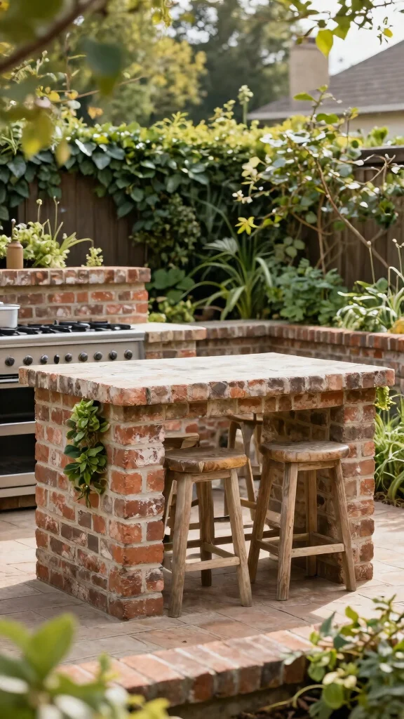 Are you drawn to traditional charm in your outdoor cooking? A rustic brick island combines timeless appeal with modern functionality. Its sturdy design seamlessly integrates with garden borders, creating a cohesive outdoor space.