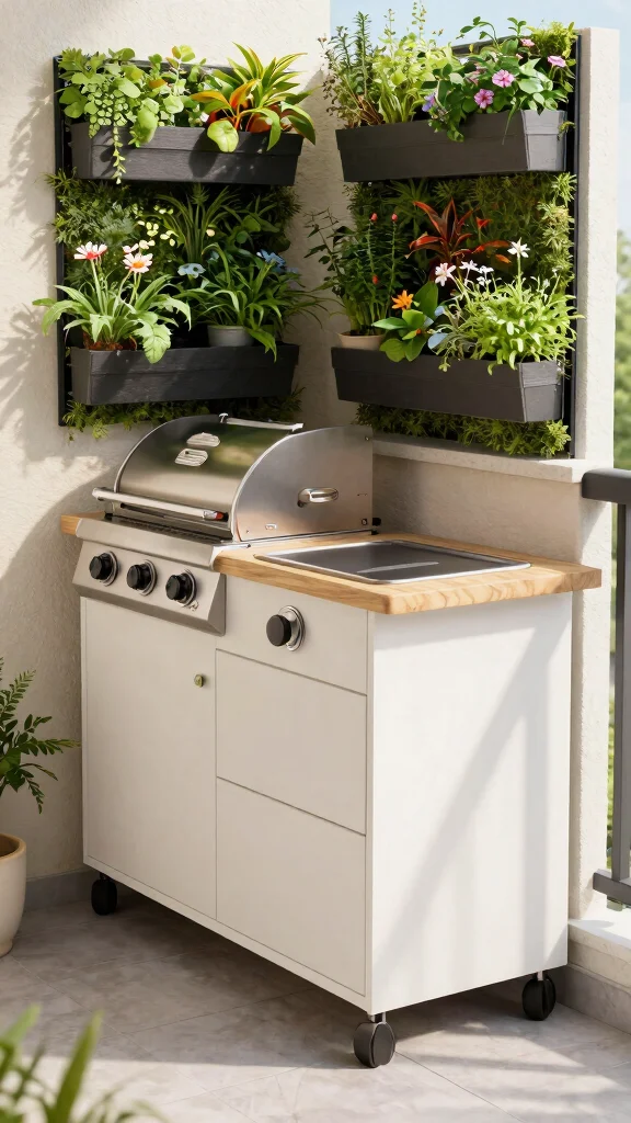 This setup invites you to enjoy gardening while cooking, turning your outdoor kitchen into a peaceful retreat.