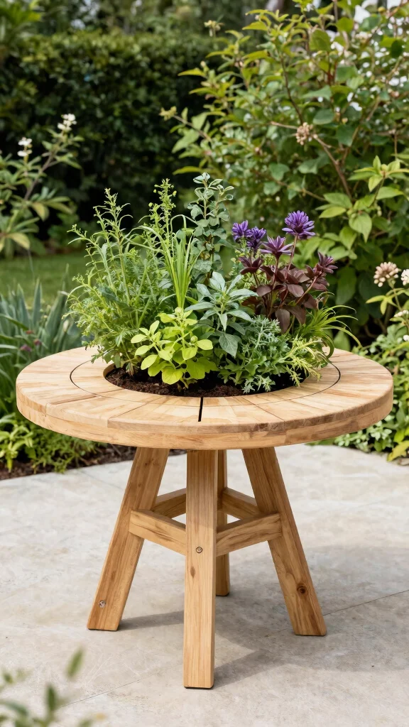For gardening enthusiasts, a garden table with an integrated herb wheel is a great addition.