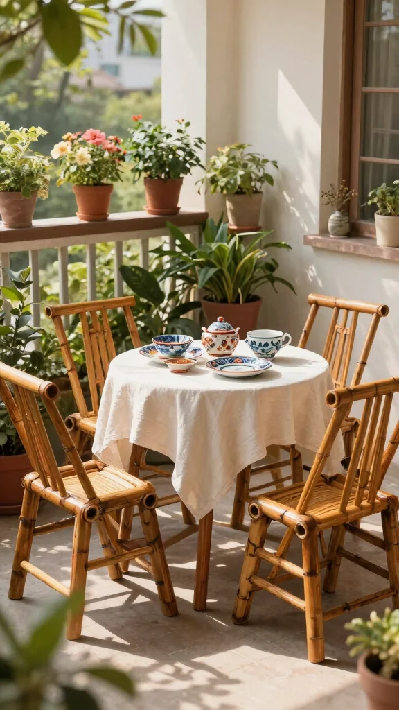 Folding bamboo chairs and tables are lightweight and versatile, ideal for compact spaces like balconies. Their natural look evokes a tropical feel, and they withstand the elements remarkably well. Elevate your dining experience by adding a soft tablecloth and locally sourced ceramics.