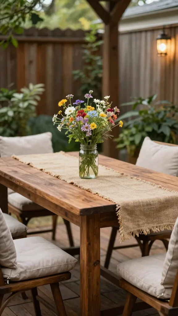 Rustic farmhouse vibes prove that comfort and durability go hand in hand for a patio table and chairs. Choose a sturdy wooden table with comfortable chairs and durable fabrics; add burlap or linen accents to boost coziness. Guests linger longer in a space that feels warm and inviting.