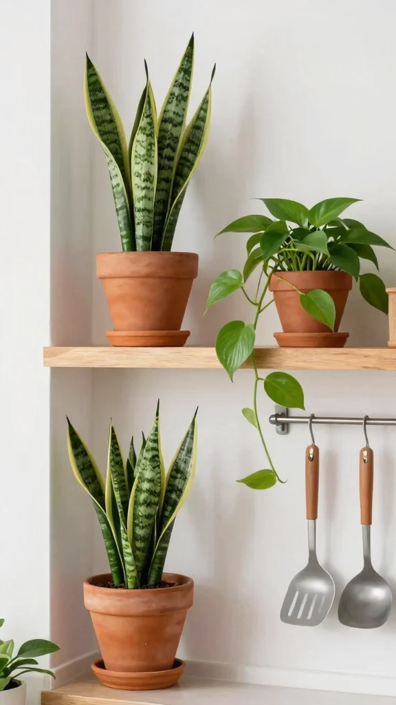 These plants not only serve a functional purpose but also enhance your kitchen’s aesthetic. For instance, the tall, architectural leaves of snake plants introduce an elegant vibe, while the cascading vines of pothos create a soft, inviting look.