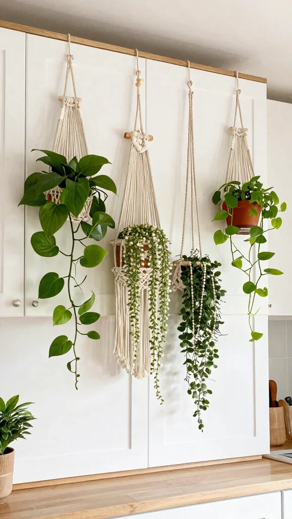 Did you know? Hanging plants can add perceived height to plants on top of kitchen cabinets by up to 20%, making the space feel taller with minimal clutter. Use macramé hangers or decorative hooks to create depth above cabinets, especially with strings of pearls or philodendrons.