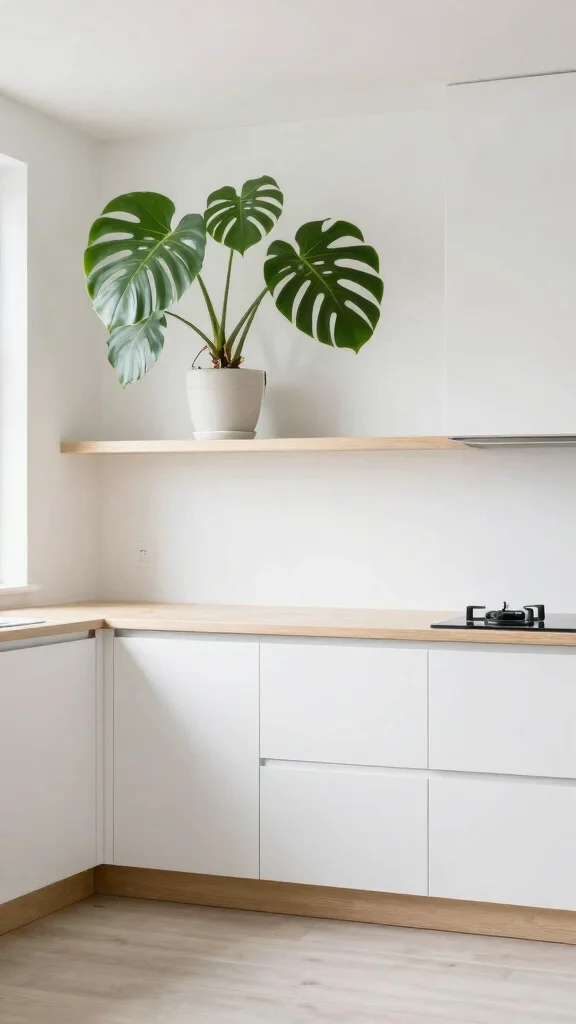 A large monstera or a simple arrangement of tall grasses can create stunning visual impact without adding clutter. This minimalist approach keeps the kitchen feeling spacious and airy.