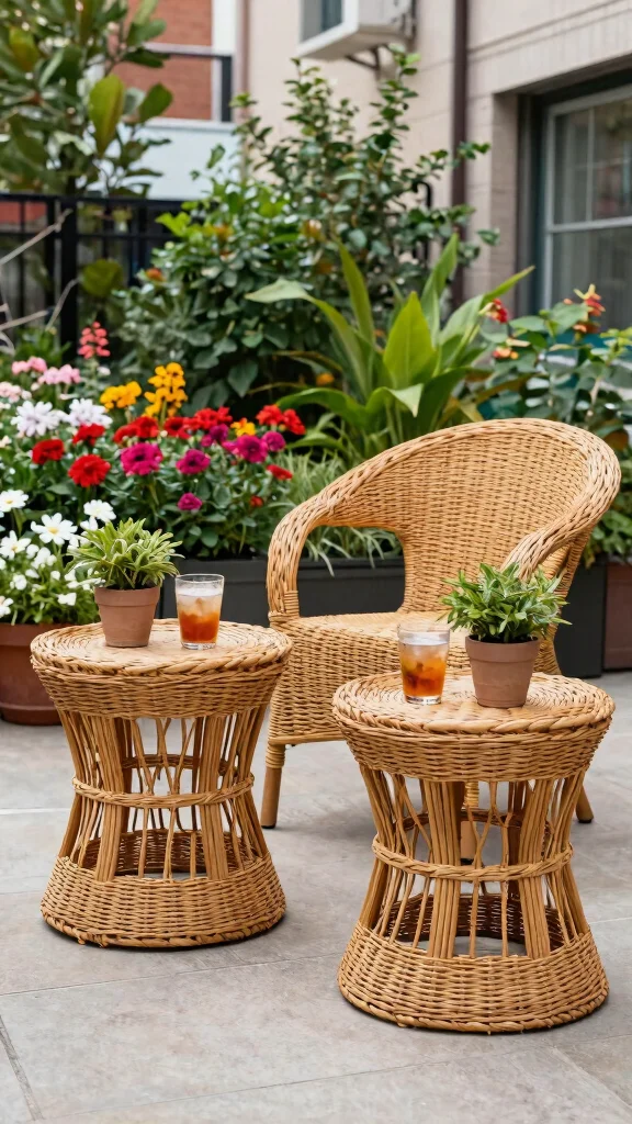 Position them beside your wicker chairs or loveseats for easy access to your favorite beverages or books. Decorate the tables with small potted plants or candles to enhance the overall ambiance.