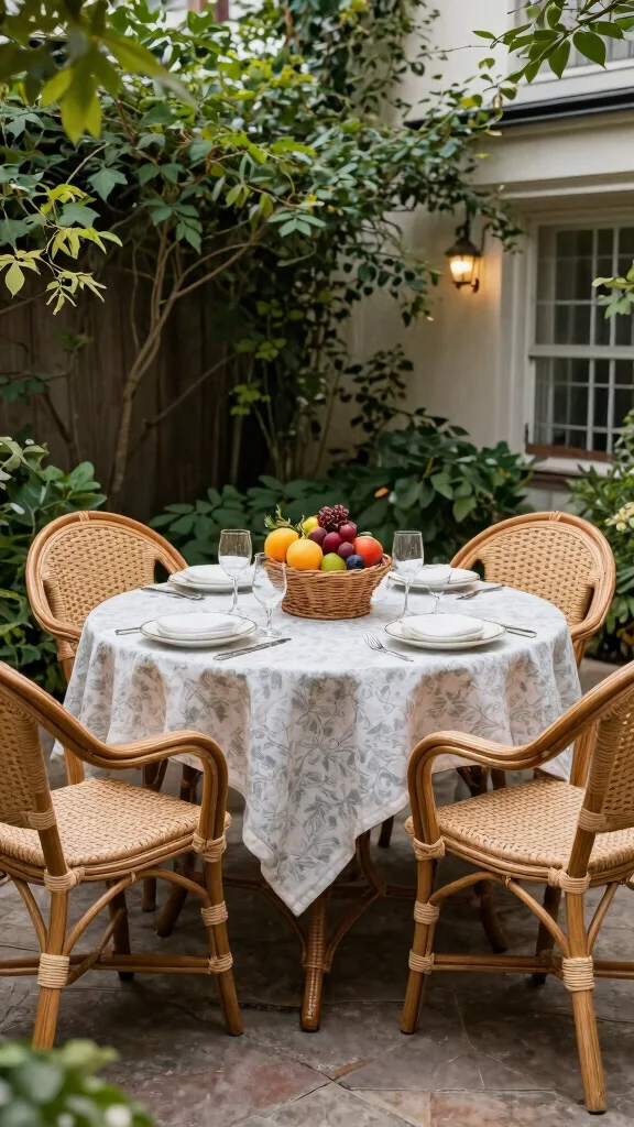 Add a simple patterned tablecloth and elegant dinnerware to enhance the dining experience. A wicker centerpiece filled with seasonal fruits or fresh flowers can also bring a lively touch to the table.