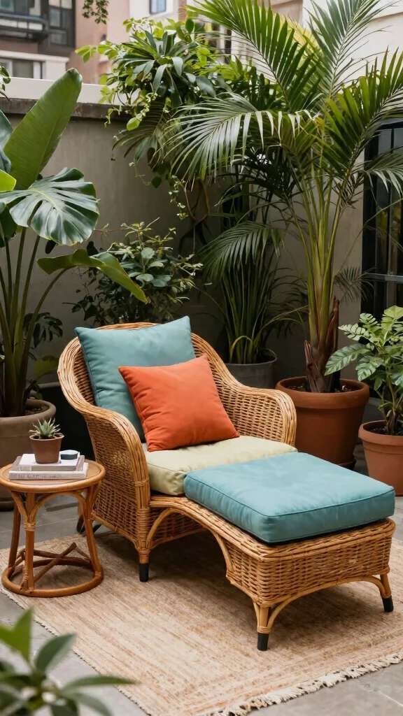 Even in a tiny urban garden, vintage wicker patio furniture like a rocking chair makes a big impact. Toss on bright cushions and a small side table, and this cozy nook becomes your go-to spot for tea, a book, and fresh air.