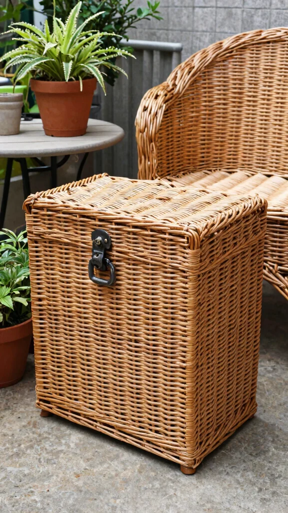 Even in a small urban garden, a vintage wicker trunk can do wonders. Store cushions, tools, and games in one stylish spot—keeping space tidy while elevating your vintage wicker patio furniture aesthetic.