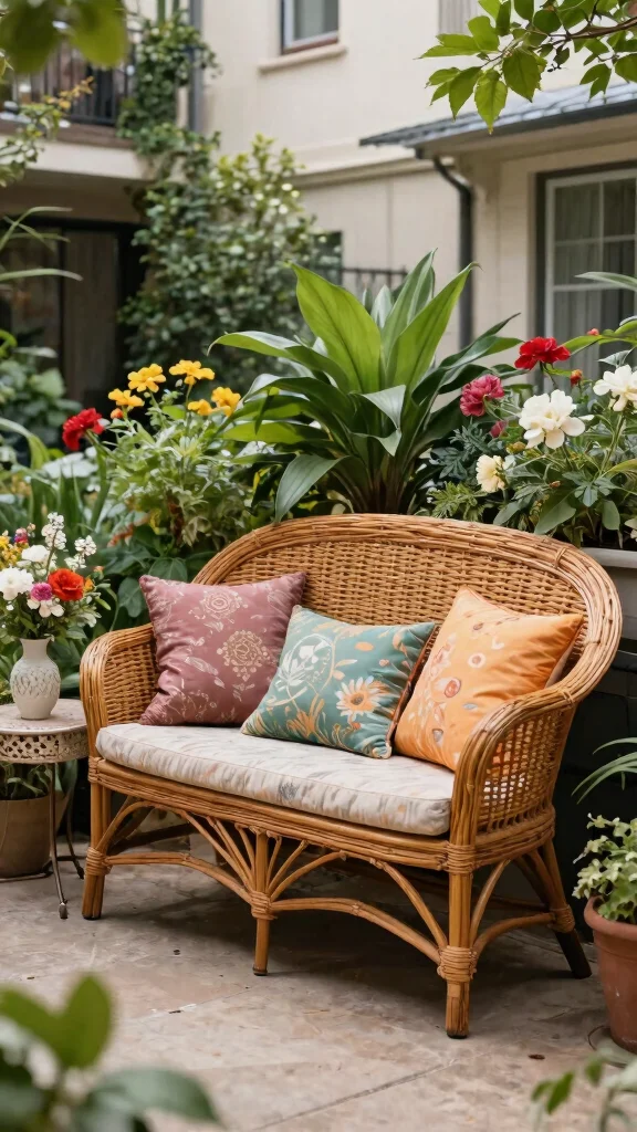 What are practical styling ideas to outfit vintage wicker furniture in a small garden without clutter?